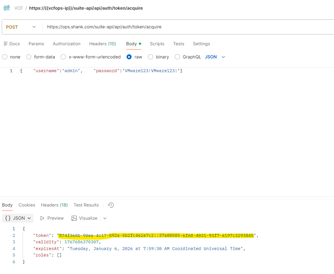 The first thing we will need to do is obtain a token from VCF Operations so we can issue the subsequent API calls.